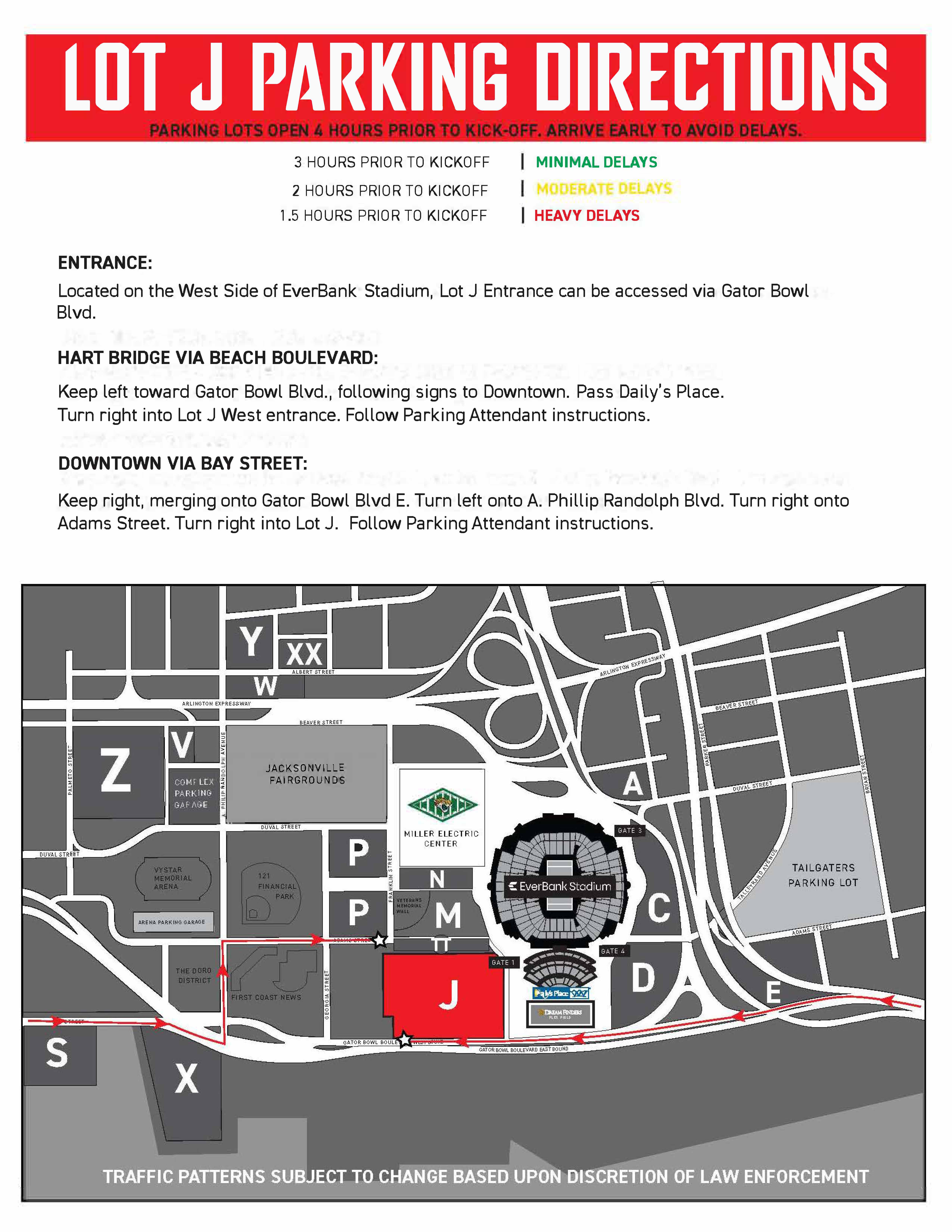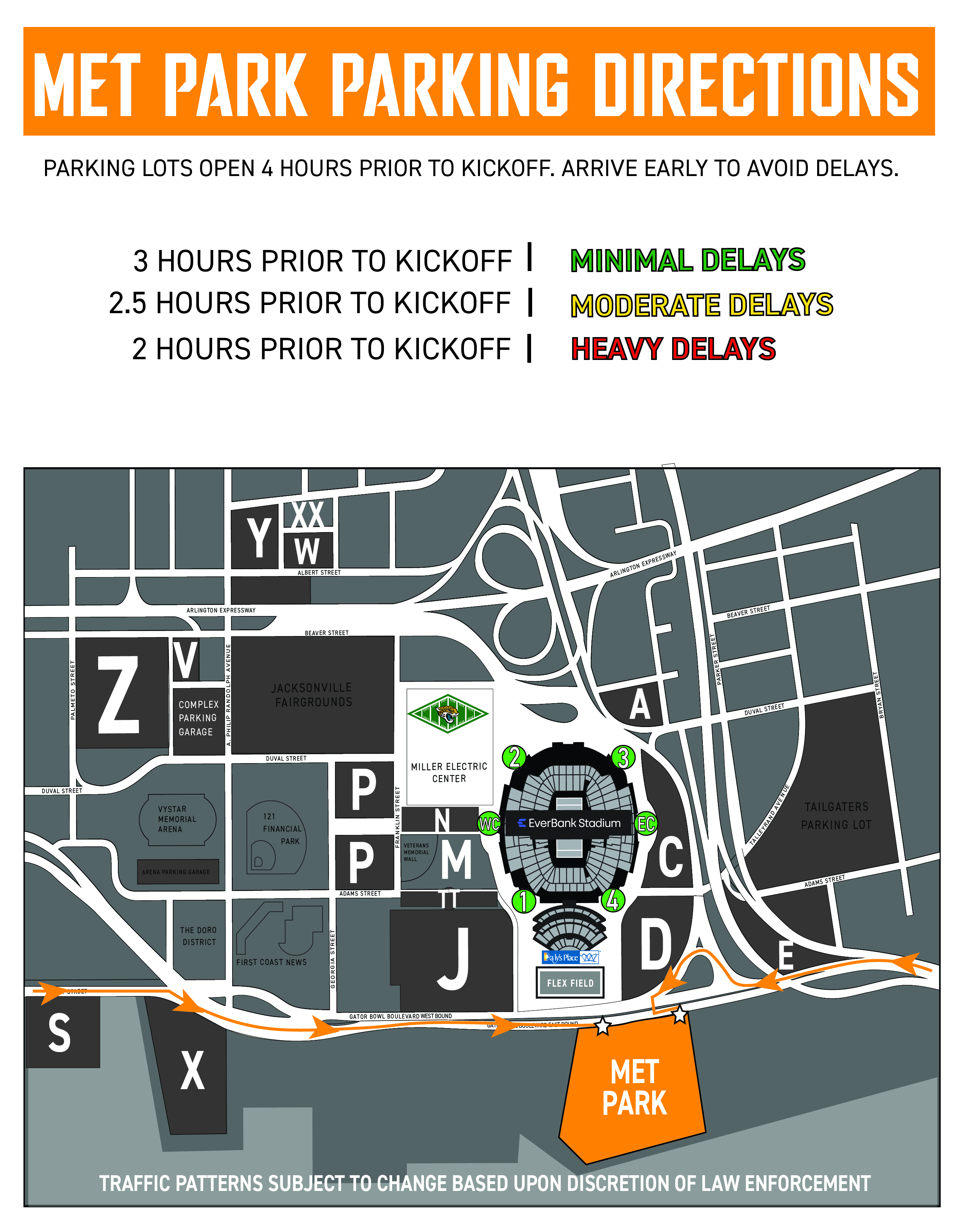 Shuttle operations are temporarily suspended at kickoff and until the conclusion of each game. Post-game pick-up for Lot S, Lot X and Lot Z via the Jacksonville Veterans Memorial Wall. Guests parked in Met Park will be able to access post-game pick-up via Lot D.