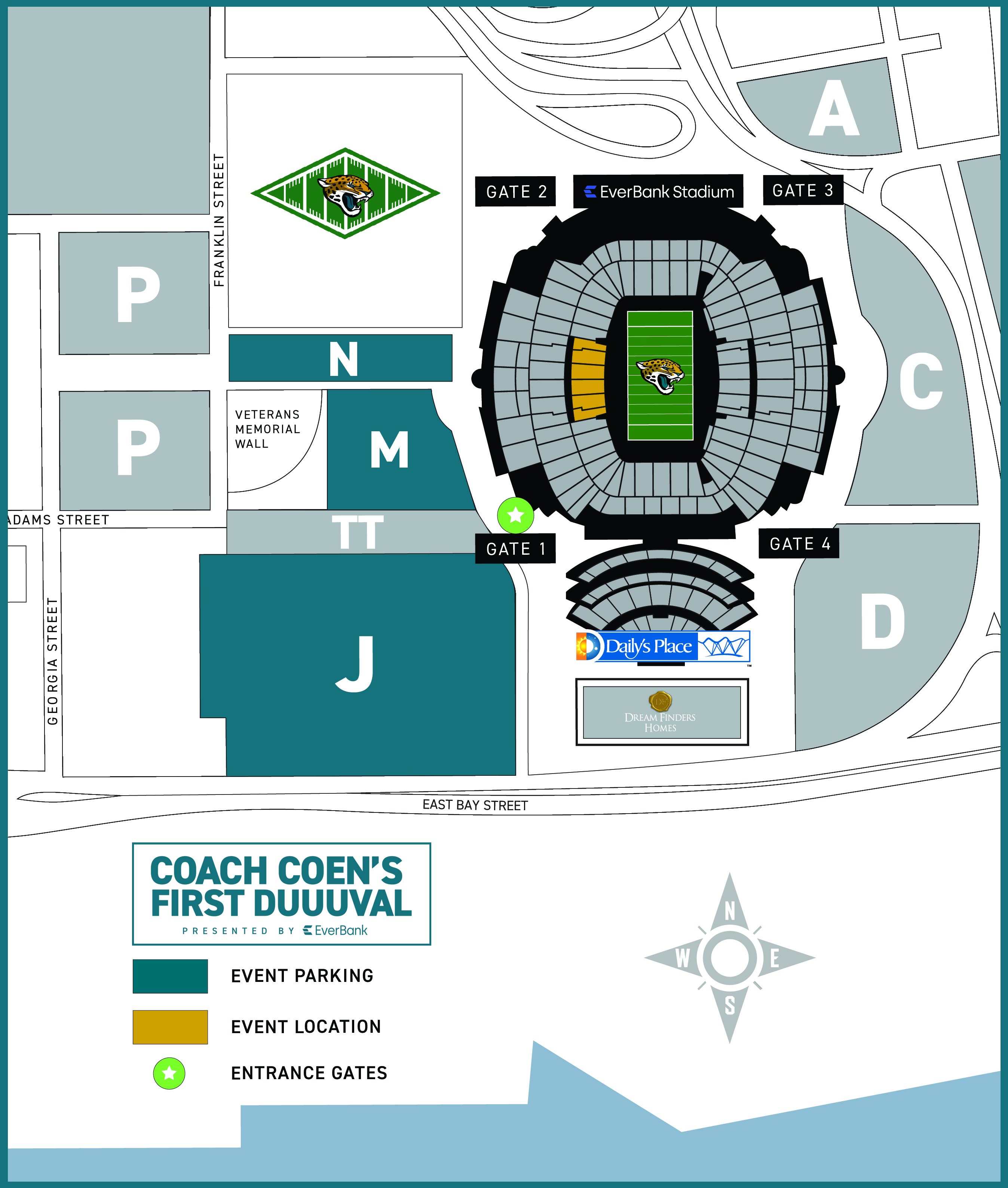 Entry to our Coach Coen's First DUUUVAL event for all ticketed guests is on the west side of the EverBank Stadium, near Lot M. View event map HERE.