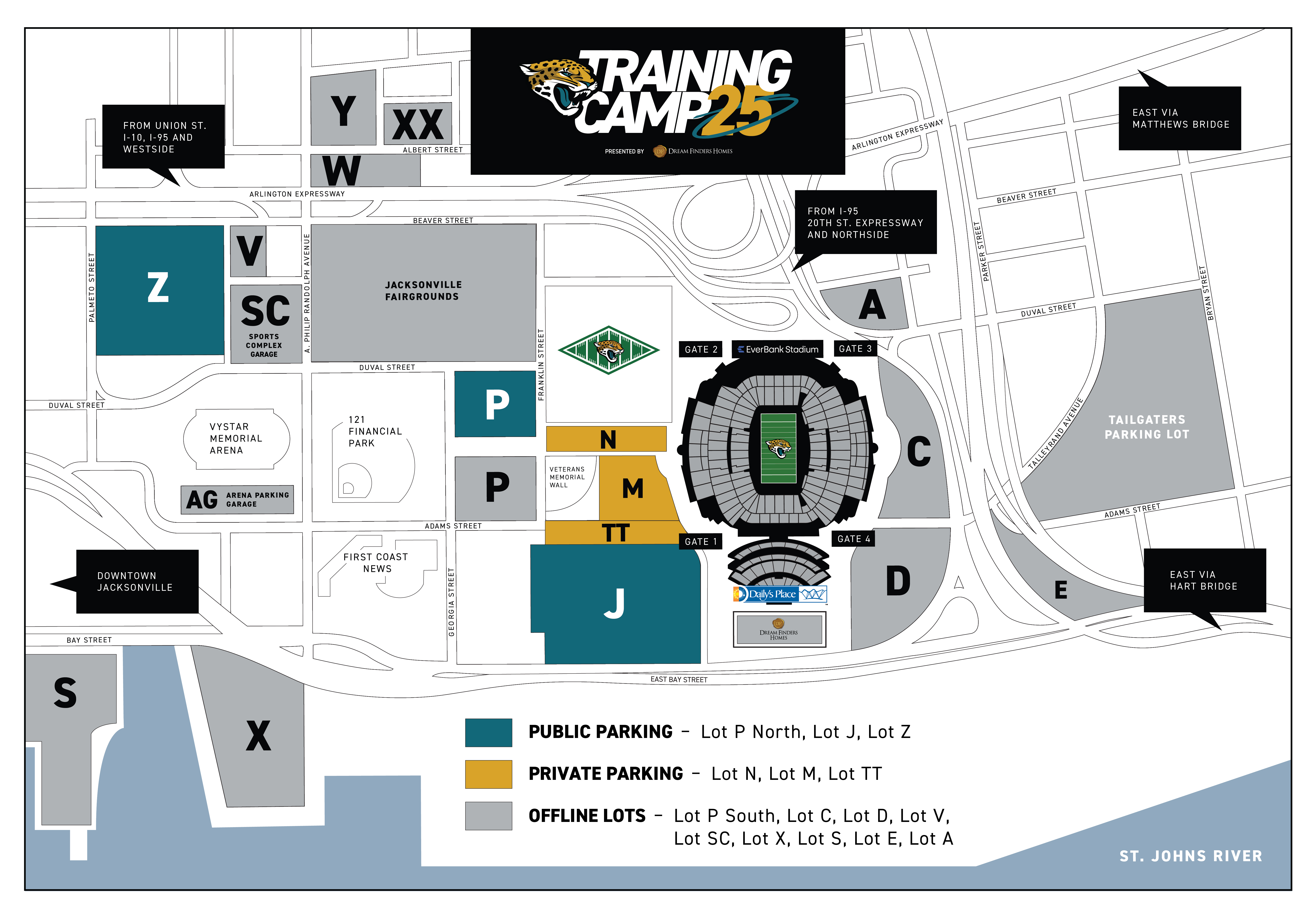 Free parking will be available throughout Training Camp for Lot J, Lot Z and Lot P North. For the Stadium Scrimmage inside EverBank Stadium on Friday, August 1, free parking will be available in Lot B, Lot C, Lot D, Lot E, Lot J, Lot S and Lot X.